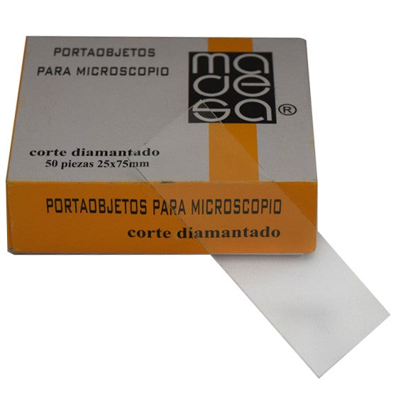 Portaobjetos o laminillas de vidrio para Microscopio, corte diamantado, 25x75mm, caja con 50 Piezas.